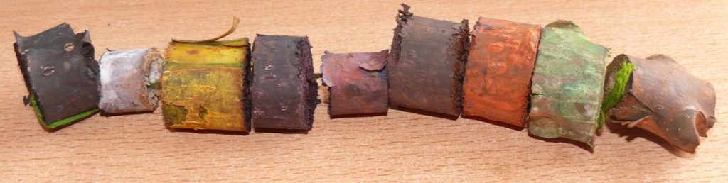 - Raupen aus Holzscheiben gesägt, bemalt und aufgefädelt.