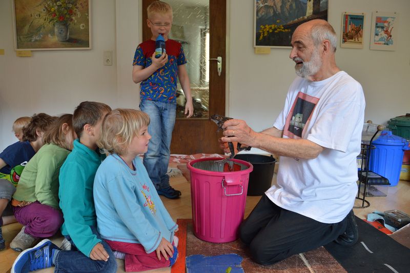 Erst hat Herr Frey von deren Lebensraum erzählt und vor allem erklärt, wie man die Tiere anfasst und behandelt, so dass sie nicht verletzt werden. Die Kinder durften die Feuersalamander, Molche und Kröten in die Hand nehmen. Es standen Eimer bereit, in die die Amphibien jederzeit abgesetzt oder auch wieder aufgenommen werden konnten. Es war schön zu sehen, wie behutsam groß wie klein mit den Tieren umgangen sind.