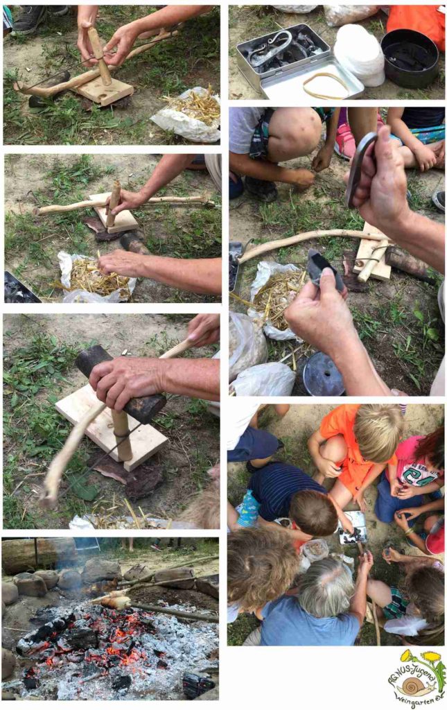 Aber letzteres wurde nicht etwa mit herkömmlichen Hilfsmitteln – sondern wie es sich für ein Naturvolk gehört – entfacht. Ein selbstgebauter Feuerbohrer, ein paar Späne oder ein Flint, also Feuerstein und Schlageisen, bei beidem etwas Geduld und das Feuer brannte.
