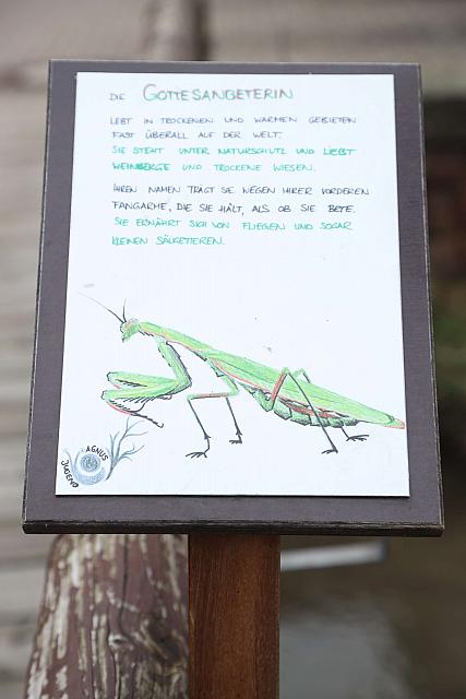 Jeder kennt die Schilder am Bach, die in Weingarten beheimatete Tier- und Pflanzenarten beschreiben. Sie wurden 2016 von der damaligen Gruppe von Synje Walheim und Susanne Ahrens gemalt und vom Bauhof entlang des Weges am Walzbach aufgestellt. Damals 12 an der Zahl, gab es 2023 Zuwachs nach Anfrage aus der Bevölkerung an den Klimabeauftragten Nicholas Schmitt: Clara hat ein Schild für die mittlerweile auch in Weingarten beheimatete Gottesanbeterin (Mantis religiosa) entworfen. Nachdem der Bauhof im Sommer 2023 das Schild an der Dehnsbrücke aufgestellt hatte, war es nach dem Wein- und Straßenfest im Juli spurlos verschwunden. Es kann nur spekuliert werden, ob die Befestigung für den rauhen Weingartener Festalltag nicht ausreichend war. Auf jeden Fall hat der Bauhof im Herbst das Schild nochmals montiert, diesmal erheblich stabiler.