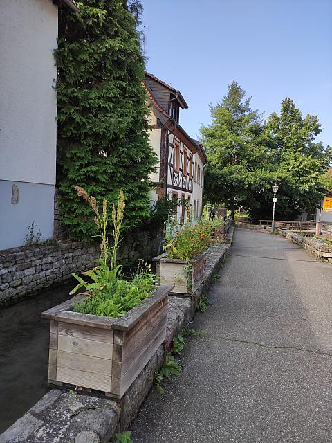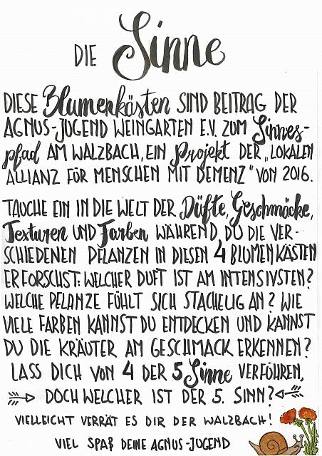 Im Rahmen des Projekts der Lokalen Allianz für Menschen mit Demenz entstand 2016 ein Sinnespfad entlang des Bachlaufs. Auch die AGNUS-Jugend hatte sich beteiligt. „Auf dem langen geraden Mauerabschnitt in der Bachstraße stehen jetzt hölzerne Kästen mit ganz unterschiedlichen Pflanzen. Manche duften wie Bergminze, Fruchtsalbei oder Currykraut und kitzeln die Nase. Andere bringen Farbe ins Spiel wie die orangene Kapuzinerkresse oder die violette Nachtkerze. Ein dritter Kasten birgt sogar Pflanzen mit Blättern zum Befühlen: zart gefiedert, rau und stachlig, pelzig-behaart und mehr.“ ( aus der Turmbergrundschau Nr. 32, 2016)
