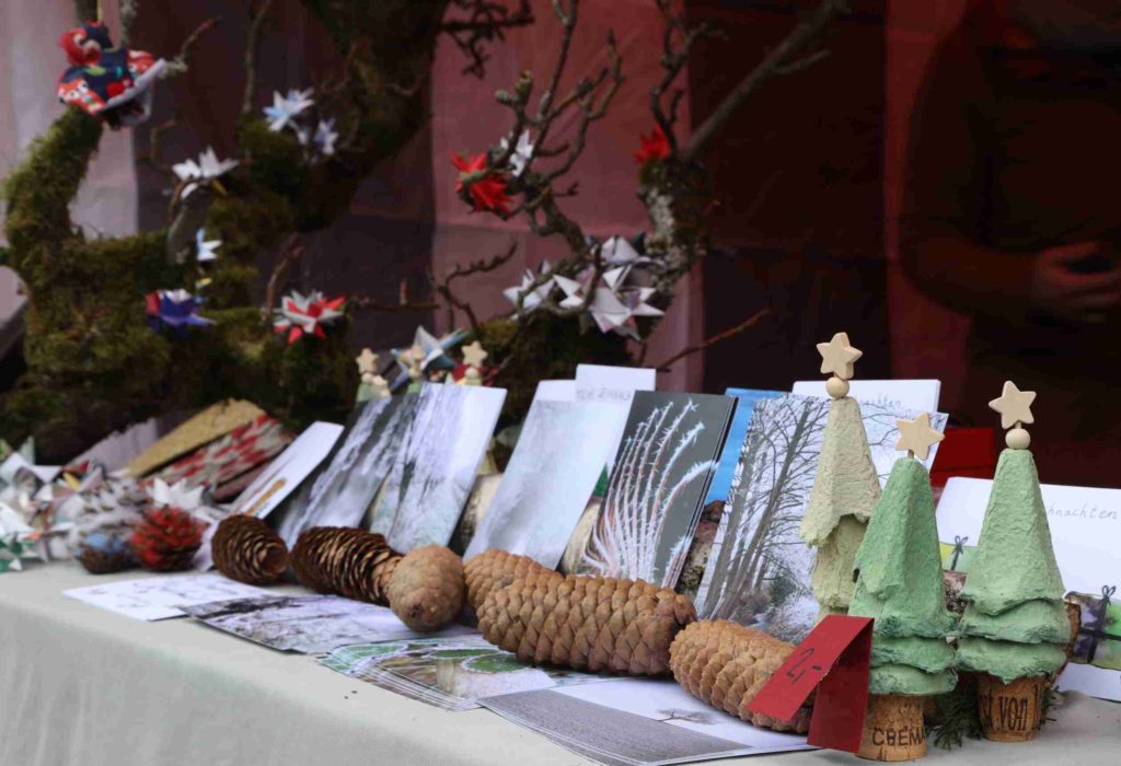Unser Stand auf dem Weihnachtsmarkt 2024 war wieder wunderschön. Diesmal gab es als Besonderheit Postkarten zu kaufen: zum einen mit fotografischen Motiven aus Weingarten von Oliver Regelmann und zum anderen von selbstgemalten Bilder von Neele Kern, Julia Schulze und Katrin Frey. Als Dekoration diente ein alter vermooster Birnbaum und Birkenäste. Auch Recycling-Tannenbäume, Fröbelsterne und Bienenwachstücher konnten erstanden werden.