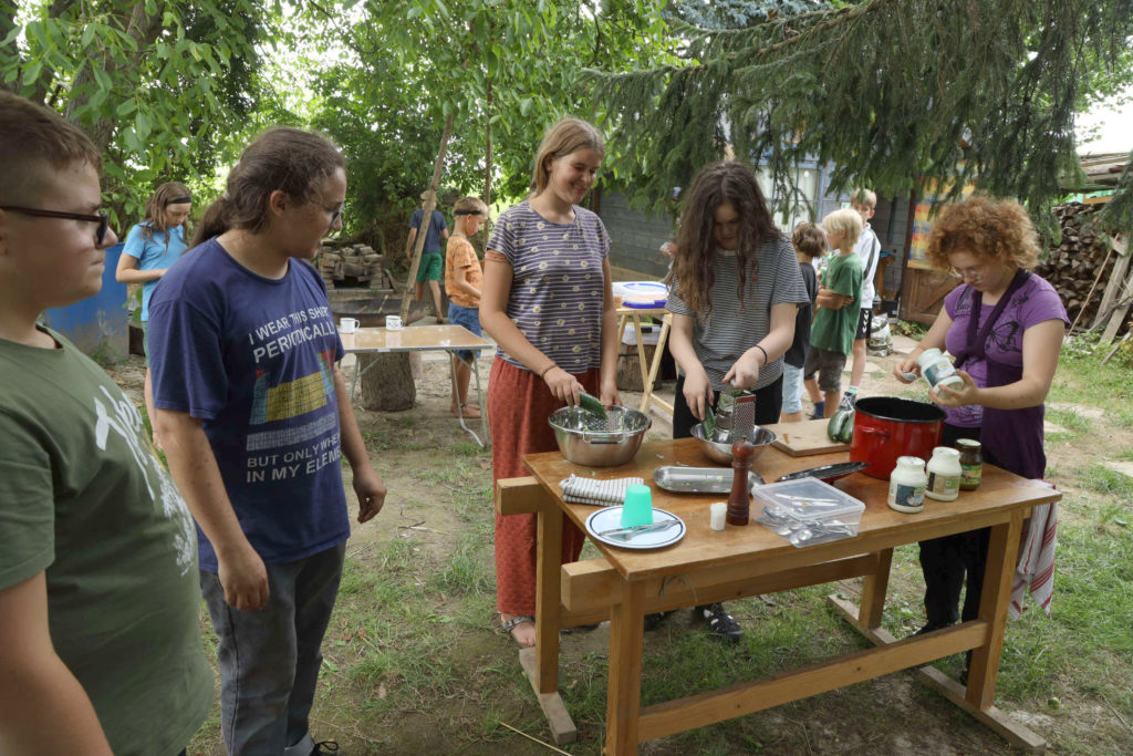 Der Platz für die Zelte hat dann am Ende auch gerade so gereicht. Nach einer Stunde Zeltaufbau und Sortierung, wer in welchem Zelt übernachtet, ging es ans Essen machen: viele Kinder hatten etwas mitgebracht, was unter allen geteilt wurde, z.B. Pizza und Würstchen im Schlafrock. Zusammen haben wir Gurkensuppe und Apfelsaftbowle zubereitet. Grillen am Lagerfeuer konnten wir aufgrund des trockenen Wetters und der Waldbrandgefahr nicht.