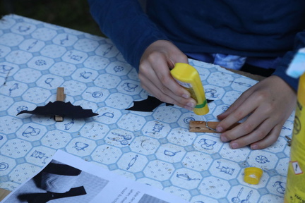 Inzwischen war es neun Uhr, aber Anfang August ist es um die Zeit noch nicht dunkel. Gut, daß auf dem vorderen Walnußgrundstück Bastelstationen vorbereitet waren. Welches ist DAS Nachttier? Natürlich die Fledermaus. Aus schwarzen Papier und Wäscheklammern entstanden viele kleine Fledermäuse, die die Kinder stolz mit nach Hause nehmen durften.