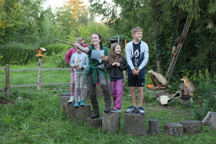 Den Abschluss der Einführungsrunde bildete ein Wissenspiel. Zu einer gegebenen Frage über Nachttiere las Försterin Motschilnig drei mögliche Antworten vor. Jede Antwort hatte eine Position im Garten und jedes Kind lief, nachdem es sich für eine der drei Antworten entschieden hatte, zu der entsprechenden Position. Die Lösung gab die Försterin mit einem „Ob ihr wirklich richtig steht seht ihr, wo der Stock hingeht.“ bekannt und deutete mit Ihrem Stock auf die richtige Position. Die meisten Kinder kannten sich sehr gut mit Nachttieren aus.