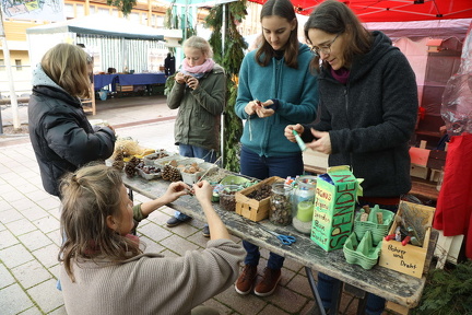 Unter einem weiteren Pavillon unmittelbar neben dem Verkaufsstand gab es einen Basteltisch, an dem wir für Kinder Basteln mit Naturmaterialien anboten und der durchgehend gut besucht war. Es ist immer wieder erstaunlich wie kreativ manche sind: Eierkarton-Tannenbäume waren dieses Jahr der Renner, aber auch Bäumchen aus Draht, umwickelt mit grüner Wolle, entstanden in den Händen der Kinder.