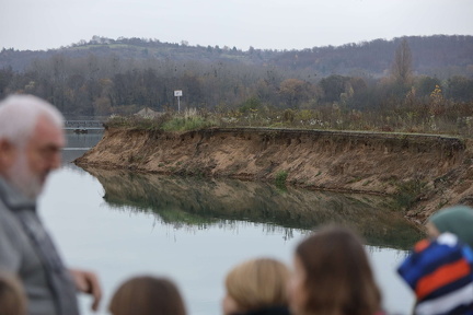 Nach der Begrüßung ging es dann auch schon los. Herr Kindermann führte uns zuerst in den abgesperrten Bereich des Baggerseeufers. (Er als Gemeindemitarbeiter durfte das natürlich; ansonsten ist das Betreten natürlich verboten.) Von dort aus konnten wir sehr gut die Nisthöhlen im gegenüberliegenden Steilufer sehen, die von Uferschwalben gebaut wurden. Auch ein bisschen Geologie bekamen wir zu sehen: Erosion durch ablaufendes Regenwasser hat das Ufer zu Canons geformt.