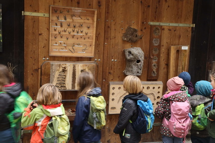 Weiter ging zur Weingartener Forsthütte. Staunend standen die Kinder vor all den verschiedenen Präparaten – Wespennester, Hirschkäferpanzer, Schlangenhäute und vieles mehr -, die an der Wand des Forstgebäudes hingen. Parallel hat Herr Kindermann ein Lagerfeuer vorbereitet, denn zuerst war Pause angesagt. Am Feuer konnten wir uns wärmen und uns mit dem mitgebrachten Proviant stärken.