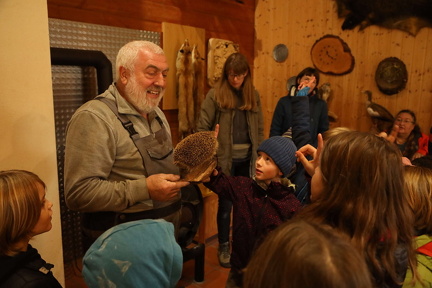 Der Höhepunkt wartete in der Hütte. Von unzähligen Tierarten waren lebensechte Präparate vorhanden, die die Kinder anfassen bzw. streicheln konnten. Betont werden muss, dass diese Tiere nicht geschossen wurden, sondern allesamt Opfer von Unfällen wurden. Bei den Vögeln hieß das meistens, dass sie an eine Fensterscheibe geprallt und leider verendet waren. Trotz dieser traurigen Tatsache war es natürlich ein Erlebnis, einen Hasen, Stein- oder Baummarder, Weißstorch, Graureiher oder gar Kormoran so aus der Nähe zu sehen. Herr Kindermann hat aus seinem unermeßlichen Wissensschatz zu jeder Tierart etwas erzählt: hier war noch ein Waldkauz, dort ein Fuchs, ein Igel, und ist das ein Biber? Nein, der hat eine breite Kelle als Schwanz, also doch ein Nutria. Herr Kindermann noch zwei ganz besondere Präparate gezeigt: eine Blindschleiche und eine Fledermaus. Beide werden in Alkohol aufbewahrt, damit sie nicht verderben.
