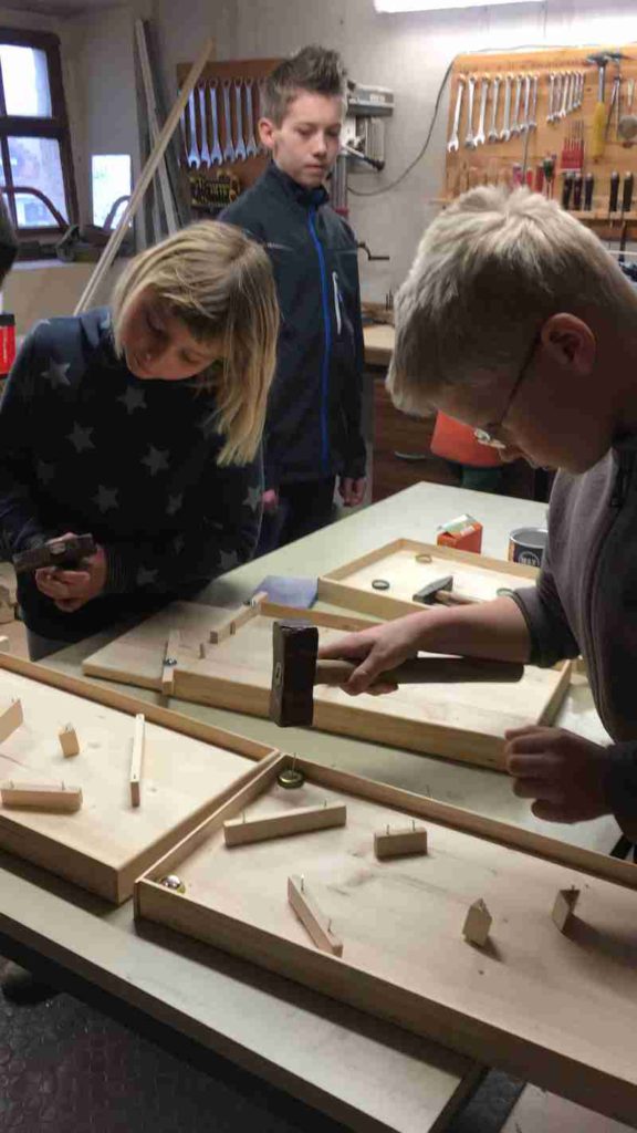 Zuvor wurde diesmal in der Winterwerkstatt fleißig gehämmert, gesägt, geschliffen und geklebt, damit alle selbstgebauten Upcycling-Produkte wie Flipper, Katapulte und Zettelboxen rechtzeitig fertig wurden und mit nach Hause genommen werden konnten.