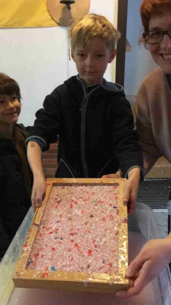 Da die Kinder bei den ersten beiden Terminen schon viel über Papierherstellung und -recycling gehört hatten, konnte das neu erworbene Wissen nun auch in die Praxis umgesetzt werden. Das gesammelte und mitgebrachte Papier war schon geschreddert und eingeweicht. Es wurde mit mehr oder weniger großer Begeisterung aus dem kalten Wasser gefischt und anschließend mit dem Mixer zu einer „Papierpampensuppe“, Pulpe genannt, püriert. Das eigentliche Schöpfen und Verzieren des eigenen Papiers und das kräftige Walken mit dem Nudelholz machte dafür umso mehr Spaß.