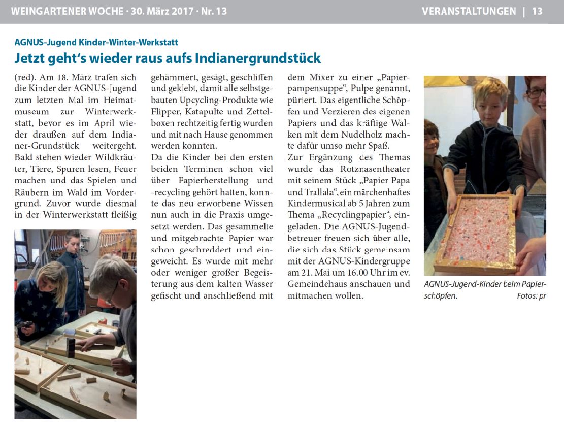 Am 18. März trafen sich die Kinder der AGNUS-Jugend zum letzten Mal im Heimatmuseum zur Winterwerkstatt, bevor es im April wieder draußen auf unserem Indianer-Grundstück weitergeht. Bald stehen wieder Wildkräuter, Tiere, Spuren lesen, Feuer machen und das Spielen und Räubern im Wald im Vordergrund.