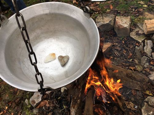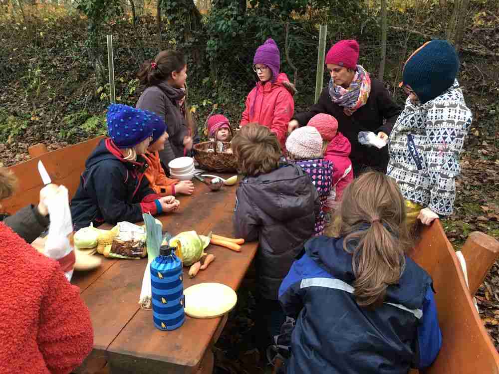 Am Sonntag, den 27. November 2016 kochten die Wurzelkinder zum Jahresabschluss ihren Gästen, die später dazu kamen, eine Steinsuppe, zu der jedes ein Gemüse mitbringen durfte – frei nach der Geschichte „Steinsuppe“ von Anais Vaugelade: „Ein Wolf besucht eine Henne, um bei ihr Steinsuppe zu kochen. Die Nachbarn sorgen sich um die Henne und kommen dazu. Der Abend wird gemütlich.“ Genau so war es. Es wurde ein gemütlicher Jahresabschluss am Feuer mit Steinsuppe (sprich Gemüse-Eintopf), Kinderpunsch und Glühwein.