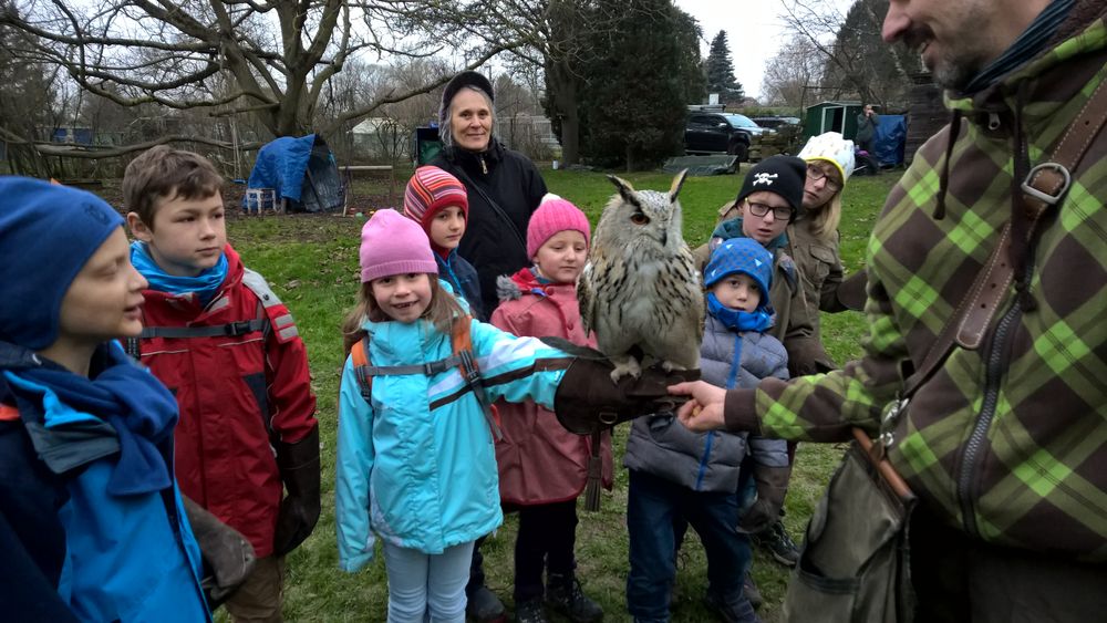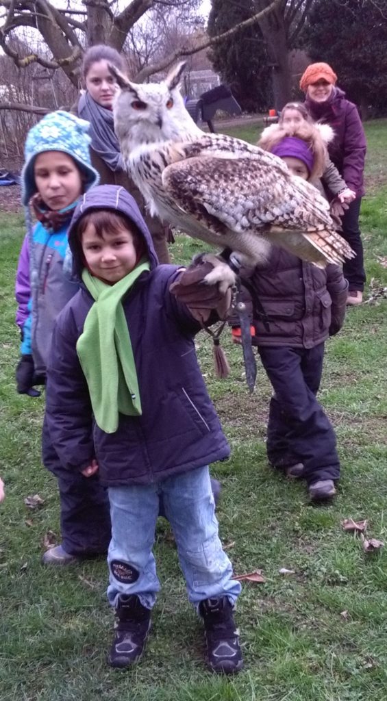Wir machten uns mit der Bahn auf den Weg nach Rintheim und nach einem kleinen Fußmarsch wurden wir von Pierre Kuhlmann begrüßt. Er fragte uns, wer schon was über Vögel wusste. Zuerst durften wir die verschiedenen Greifvögel und Eulen mit einigem Sicherheitsabstand in ihren Gehege anschauen und erfuhren dabei einiges über die einzelnen Vogelarten. Zum Beispiel, dass auf der 1- und 2-Euro Münze der europäische Seeadler zu sehen ist. Nach einer Einführung in die Welt der unterschied-lichsten Greifvögel durften die Kinder Bussard, Uhu und Schleiereule aus nächster Nähe sehen und füttern. Zuerst zeigte uns Pierre einen Weisskopfseeadler, das Wappentier der USA. Erstaunlicherweise hatte der noch keinen weißen Kopf, weil er noch keine 5 Jahre alt war. Pierre Kuhlmann erklärte uns den Unterschied zwischen den habichtartigen und den falkenartigen Greifvögeln. Schon das hat uns imponiert, aber das absolute Highlight war die Landung der Vögel auf dem eigenen Arm. Der Harris Hawk, ein Wüstenbussard, den wir schon bei Herrn Manz kennengelernt hatten, wurde genauso wie die Schleiereule und der Uhu mit Stückchen von männlichen Eintagesküken aus dem Falknerhandschuh gefüttert. Dabei hatte jedes Kind, das sich traute, diese drei Tiere auf dem Arm. Am Schluss konnte jeder noch den Uhu streicheln. Es war ein super Ausflug, den alle gerne wiederholen würden. Voller Begeisterung hiess es: „Da muss ich unbedingt nochmal hin!“ Also lasst uns weiter Korken sammeln. Die Sammelbehälter dafür stehen in jedem Kindergarten sowie im Rathaus bereit!