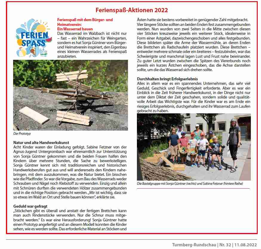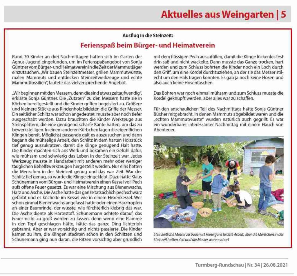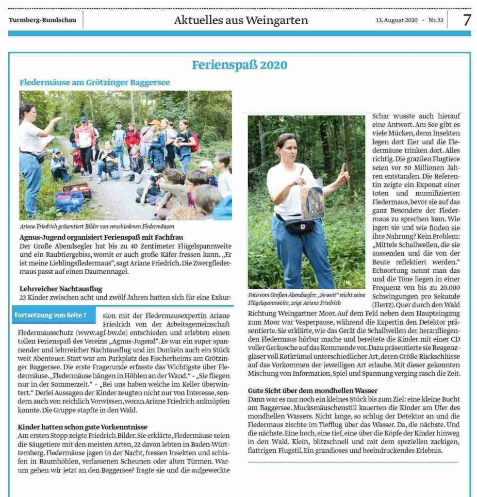 Bei der AGNUS-Jugend in Weingarten geht es ums Naturerlebnis Bericht in der BNN vom 15. Juli 2023, Frau Marianne Lother Die Arbeitsgemeinschaft Natur- und Umweltschutz in Weingarten organisiert ihre Jugendarbeit in einem eigenen Verein. Seine Haupttätigkeiten sind Umweltbildung und Naturpädagogik für Kinder und Jugendliche. https://bnn.de/karlsruhe/karlsruher-norden/weingarten/bei-der-agnus-jugend-in-weingarten-geht-es-ums-naturerlebnis(Artikel auf Anfrage)