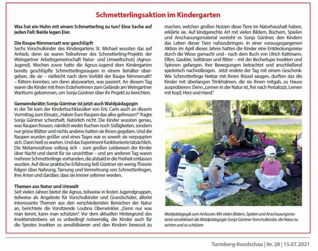 Unsere Kindergarten-Aktion mit den Vorschulkinder war dieses Jahr wieder ein voller Erfolg.Wir haben uns nochmal für Schmetterlinge entschieden. Die Vorschulgruppen bekamen im Mai ein Aufzucht-Set zur Verfügung gestellt. Dieses enthielt einen Becher mit Distelfalter-Raupen und Fraßmittel und ein Beobachtungsset für die Schmetterlinge. Fast alle Raupen haben sich verpuppt, meist nachts und nach ein paar Tagen Beobachtung wurden die Distelfalter frei gelassen. Anschließend im Juni und Juli kamen die einzelnen Vorschulgruppen (durch Corona bedingt waren es mehrere pro Kindergarten) zu einen Termin am Turm, bei dem unsere Naturpädagogin Sonja Güntner den Vorschulkindern einiges Wissenswertes über Schmetterlinge spielerisch beibrachte. Auch ein Besuch im Turm des Bürger- und Heimatvereins stand auf dem Programm, wo bei einem Rundblick über Weingarten der eigene Kindergarten gesucht wurde.