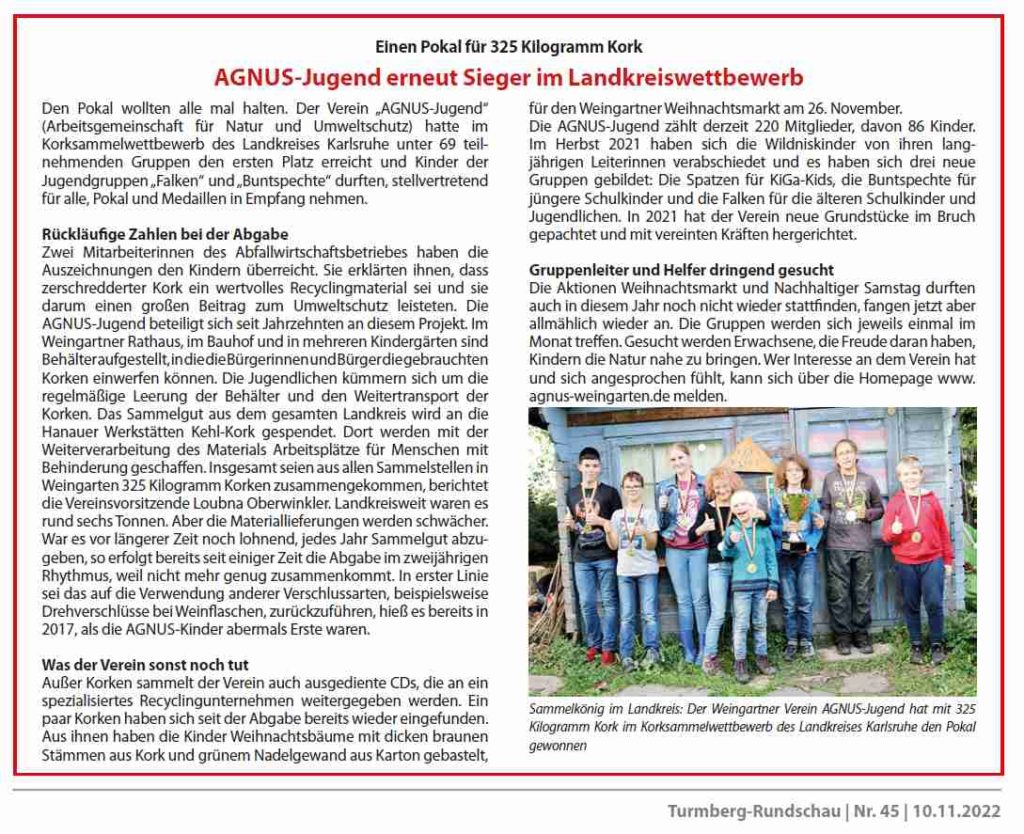 2025 waren es auf einmal 10 Jahre. 10 Jahre gemeinsames Projekt „Kinder für die Natur begeistern“ von der AGNUS-Jugend und dem Bürger- und Heimatverein Weingarten. In diesen 10 Jahren konnten wir unzähligen Kindergartengruppen und Schulklassen an vielen Vormittagen Naturerlebnisse bieten. 2016 haben wir für dieses Projekt gemeinsam den 1. Preis vom Kreisumweltschutzpreis „Umweltschutz mit Kindern – Umweltpädagogik“ gewonnen.
