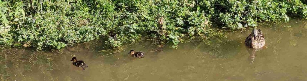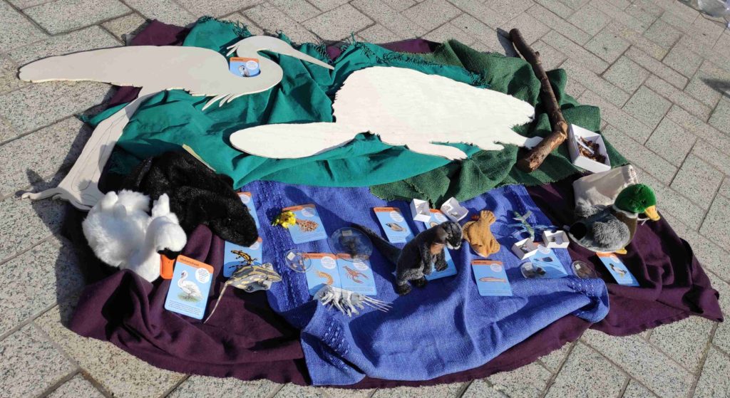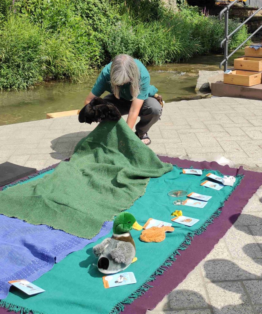 Als Einführung durften die Kinder Tiere im Bach, die sie kennen, nennen. Sonja hatte allerlei Anschauungsmaterial auch aus dem Heimatmuseum dabei und einige Tiere, wie eine kleine Entenfamilie oder die Blauflügel-Prachtliebelle, zeigten sich uns auch direkt. Anhand von Modellen konnten die Kinder die Größe eines Bibers oder eines Reihers erfahrenoder mithilfe echter Präparate, entdecken, wie andersartig Libellenlarven aussehen.
