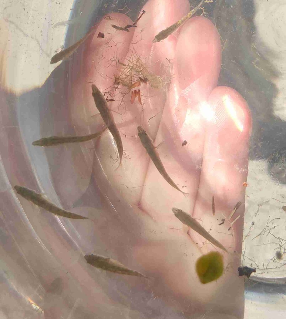 Danach gingen wir in den Bach, um einige Tiere vorsichtig mit Becherlupen und Keschern zu fangen. Der Fischschwarm der Stichlinge schwamm weiter direkt neben unseren Beinen, die blaugefärbten Männchen der Blauflügel-Prachtlibellen saßen weiter auf Pflanzen am Bach und auch die Wildenten mit großen und kleinen Entenküken sind zwischen uns geschwommen. Gefangen wurden viele Bachflohkrebse, Dreieckkopf-Strudelwürmer, Egel und weitere Tiere mehr und manche Kinder haben es sogar geschafft einige der flinken Stichlinge zu fangen. Die Tiere wurden gemeinsam angeschaut und bestimmt, bevor sie wieder freigelassen wurden.