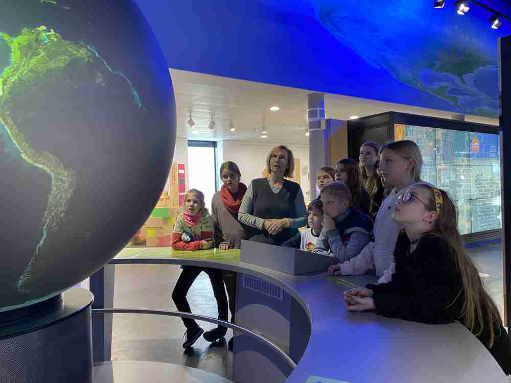 Danach haben wir eine Führung durch die ganze Klimaarena bekommen. Da gab es riesige interaktive Leinwände. Auf einer war ein Haus zu sehen und man konnte von Zimmer zu Zimmer wechseln und erkennen, was im Alltag Strom verbraucht. Außerdem gab es einen riesigen Globus, auf dem man sehen konnte, wo es gerade große Brände gibt.