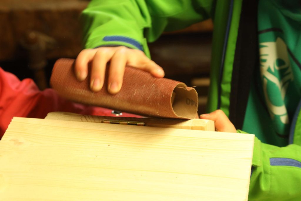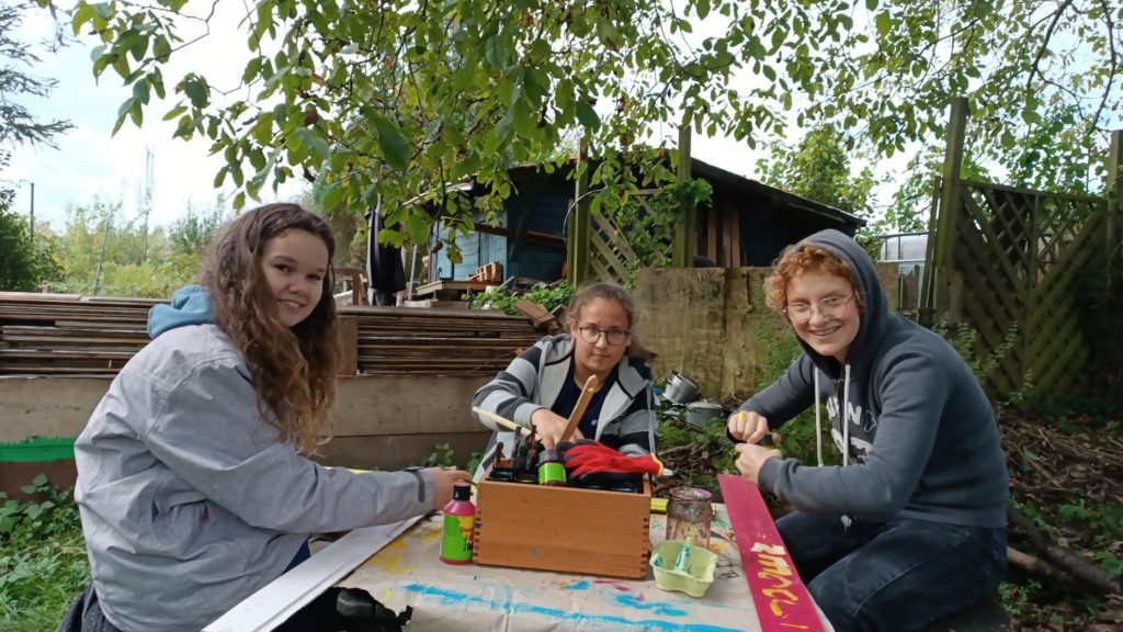 Am Samstag, 28. September trafen die Falken sich mit Loubna und Wolfram auf unserem Grundstück. Es galt, kleine Holzkistchen für das Regal in der Hütte zu bauen, die einige Pappkartons ersetzen sollten. Dafür verwendeten die Jugendlichen Holzreste vom Umbau der Hütte. Dazu drehten sie eine Kordel aus Schnur für Haltegriffe. Nebenbei wurden auch weitere Schilder für unsere Obstbäume grundiert, die noch beschriftet werden müssen.