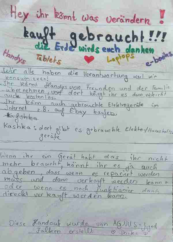 Nach einer Pause zum Bewegen und Lüften begann eine Gruppenarbeit, bei der gefragt war, bei der Ernährung CO2-Äquivalenten pro Lebensmittel in eine Reihenfolge zu bringen, beim Kleiderkonsum die Reise einer Jeans um die Welt auf der Landkarte darzustellen und bei Elektronik die Standorte der Materialen auf einer Karte und im Handy zu lokalisieren