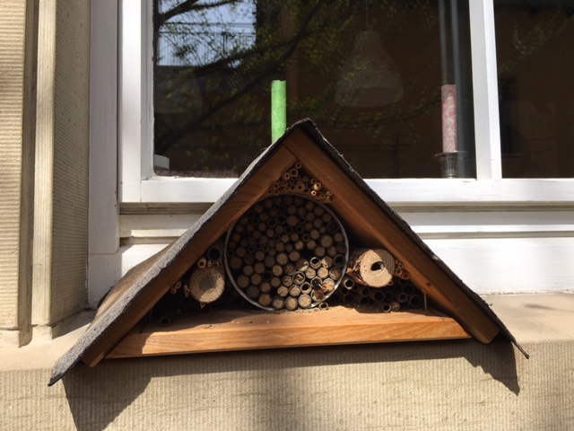 „Das Insektenhotel, dass die Wildniskinder 2020 gebaut haben, hat ein Kind auf dem Fensterbrett nahe der Eingangstür abgestellt. Wir wollten noch einen geeigneten Platz finden, irgendwo an der Mauer im Garten. Aber dann bemerkten wir, dass sich ganz schnell die ersten Bienchen einnisteten und der Standort perfekt ist:: geschützt, sonnig und warm durch den Sandstein. Jetzt hat es also spontan seinen guten Platz gefunden und wir freuen uns am emsigen Fliegen und Summen. Das war eine sehr schöne Initiative!“