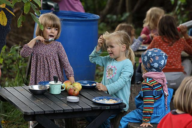September – Apfelzeit. Am 25.09. schauten sich die Rotkehlchen Äpfel an; nein, sie ertasteten sie. Mit einem Tastsäckchen, in dem ein Apfel steckte, musste erstmal erraten werden, worum es an diesem Tag ging. Dann ging es zusammen los zu den von der AGNUS-Jugend gepachteten Apfelbäumen am Graben. Toll, dass es so nah am Grundstück Äpfel gibt, die man ernten und mitnehmen kann. Die Äpfel wurden dann mit Elternhilfe kleingeschnitten und am Feuer zu Apfelmus verarbeitet. Dazu gab es Sahnereis, der auch am Feuer zubereitet wurde. Das hat alles wahnsinnig lecker geschmeckt.