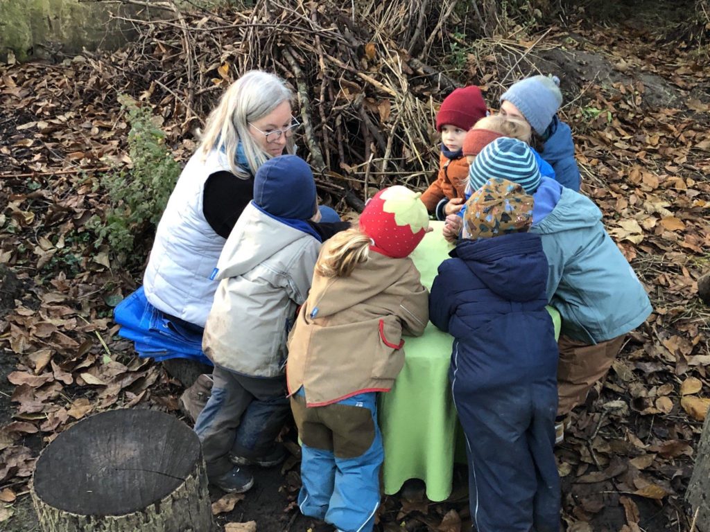Das erste Treffen im Januar fiel aus, das Rotkehlchenprogramm ging daher am 21. Februar los mit dem Thema: „Wir schauen, was die Natur uns zeigt.“ Schon kurz nach Beginn trafen einige Eltern die Vorbereitungen, damit später das leibliche Wohl nicht zu kurz kommt: Feuermachen, erhitzen der Kochtöpfe mit Teewasser oder Apfelsaft, Vorbereitung des Waffelteiges. Aber zuerst ging es in Kleingruppen auf das hintere Grundstück, auf dem in Spaziergängen entdeckt werden konnte, was dort zur frühen Jahreszeit schon wächst: Salweide, Pollenweide, kriechendes Fingerkraut, stumpfblättriger Ampfer, viermänniges Schaumkraut, wilde Karde, Holunder. Dabei wurde auch ein Igelüberwinterungsplatz entdeckt. Nach der Exkursion konnte jedes Kind seinen Eltern von seinen Entdeckungen erzählen und davon, welche Pflanze am eindrucksvollsten war. Anschließend ging es wohlverdient zum Feuer, wo schon der Waffelteig und die Waffeleisen bereit waren.