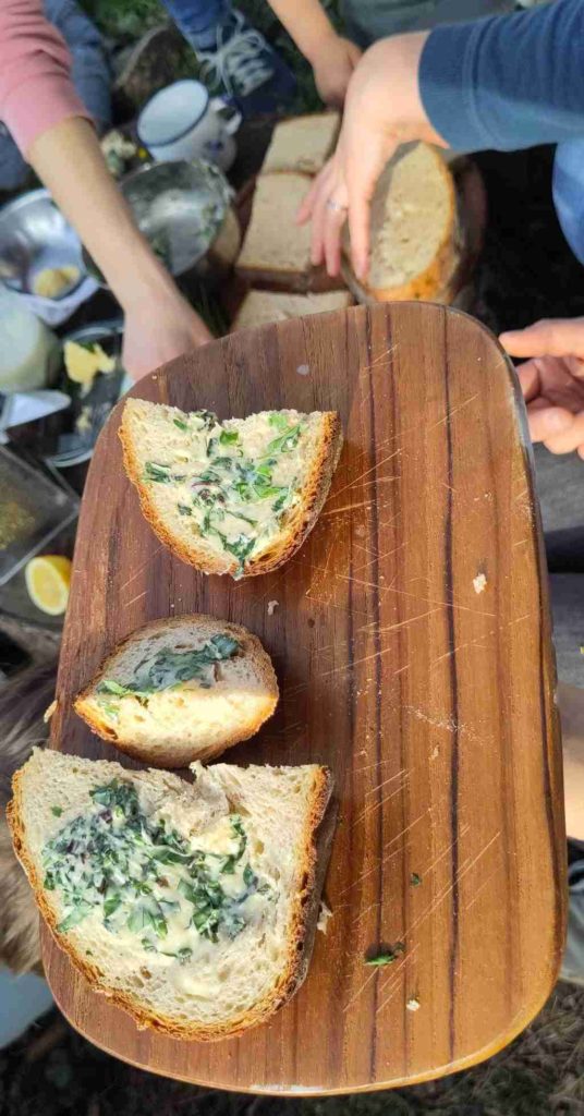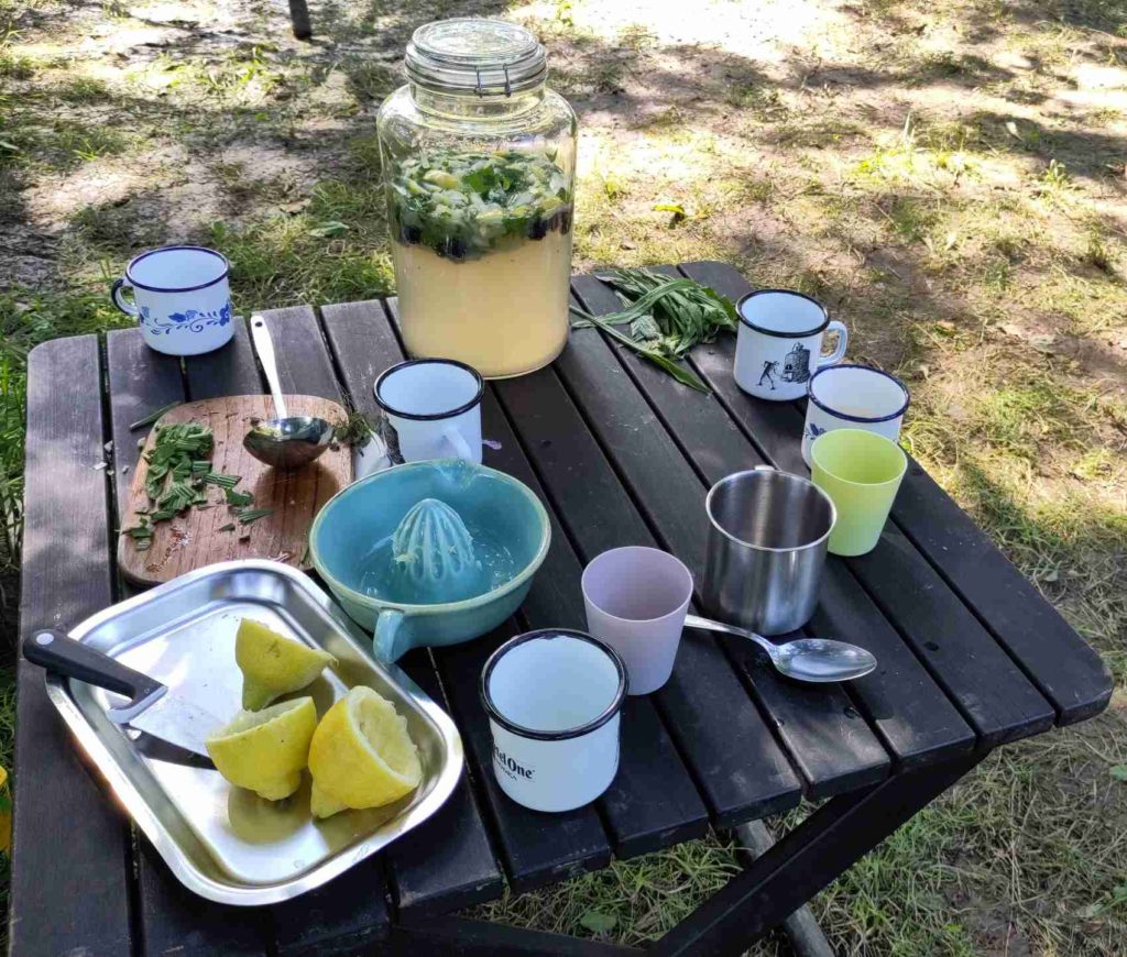 Das zweite Treffen fiel am 20. März fast pünktlich auf den Frühlingsanfang. Was gibt es auf den Grundstücken zu sehen? Welche Knospen und welche Blüten gibt es, wie duften sie? Welche Tiere sind unterwegs? Der Frühling ist etwas für alle Sinne, und daher gab es ihn auch zu fühlen: in einem Säckchen konnten die Kinder Weidenkätzchen, Knospen, weiches Gras und Gänseblümchen ertasten. Überall wuchsen bereits verschiedene Kräuter, was ein guter Anlass, war eigene Kräuterbutter herzustellen, die alle auf Brot probieren konnten. Aus Himbeerblättern, Spitzwegerich, Löwenzahn, Blutampfer, Honig, Rohrzucker, Zitrone und saurem Sprudel wurde eine leckere Limonade hergestellt.