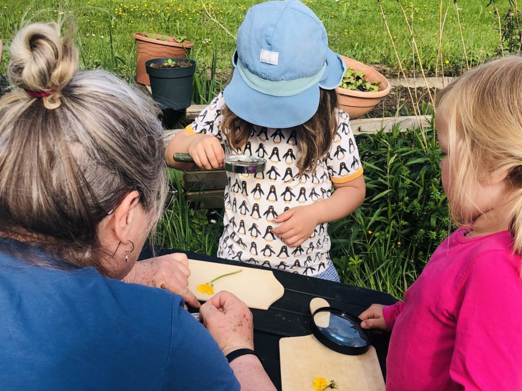 Am 29. April drehte sich alles um den Löwenzahn. Warum heißt er eigentlich so? Klar: die Zähne am Blattrand. Und welche Tiere mögen Löwenzahn? Zum einen haben ihn Kühe zum fressen gern, zum anderen natürlich auch Pferde oder Kaninchen. Angeblich soll ja die Butter von löwenzahnfressenden Kühen besonders gelb werden. Und natürlich mögen auch die Bienen Löwenzahn, genauer gesagt dessen Nektar und Pollen. Auf der Wiese konnten die Kinder Löwenzahnblüten suchen und sammeln. Sie zeigten dann auch ganz stolz die Funde ihren Eltern und sahen sich mit ihnen die verschiedenen Entwicklungsstadien der Blüte an.