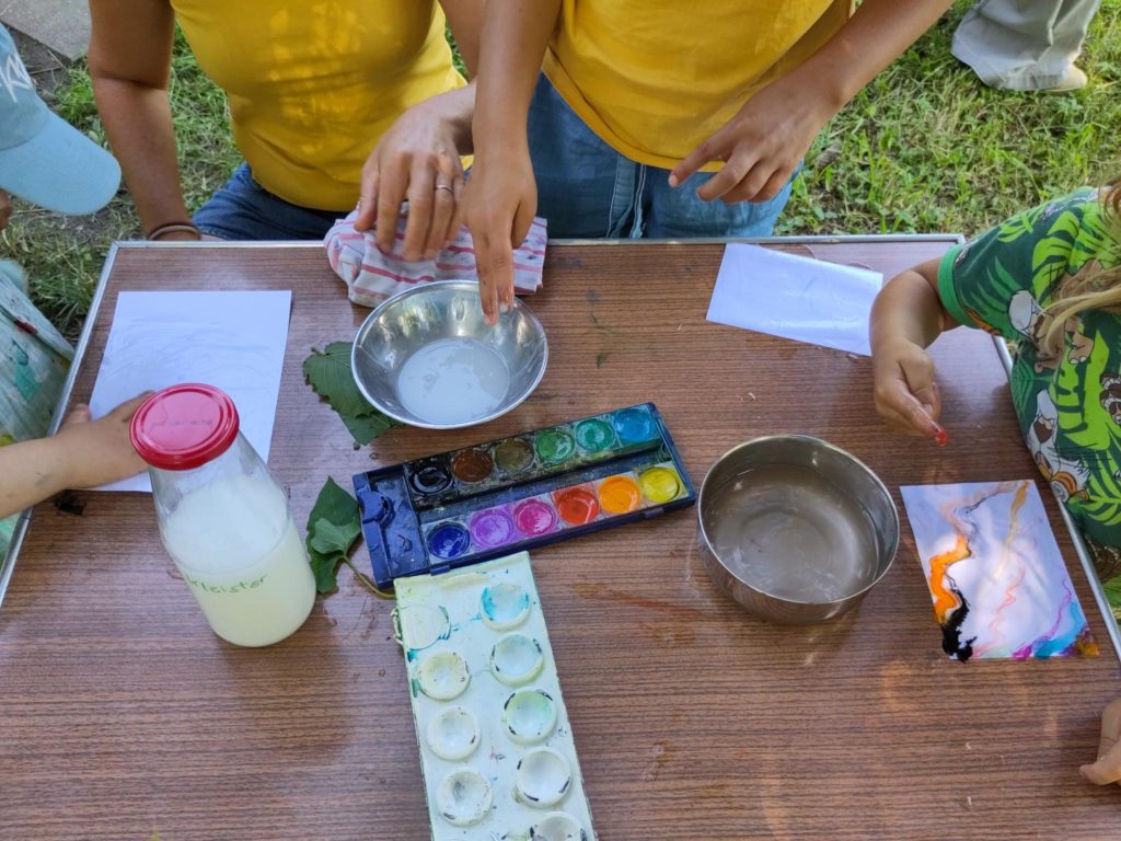 Jeder weiß, was eine Schnecke ist; zumindest weiß jeder, wie es ist, so langsam wie eine Schnecke zu laufen. Am 17. Juli konnten die Rotkehlchen zeigen, was sie von Schnecken schon wissen. Echte Schnecken waren an diesem warmen, trockenen Sommertag leider eine Seltenheit, aber dafür konnten die Rotkehlchen welche malen: auf Papier mit Wasserfarben und Kleister. Da hatte man an den Händen einen schleimiges Gefühl wie von richtigen Schnecken. Zur Erfrischung gab es an diesem tollen Tag selbstgemachte Limonade mit Zitrone und wilden Wiesenkräutern.