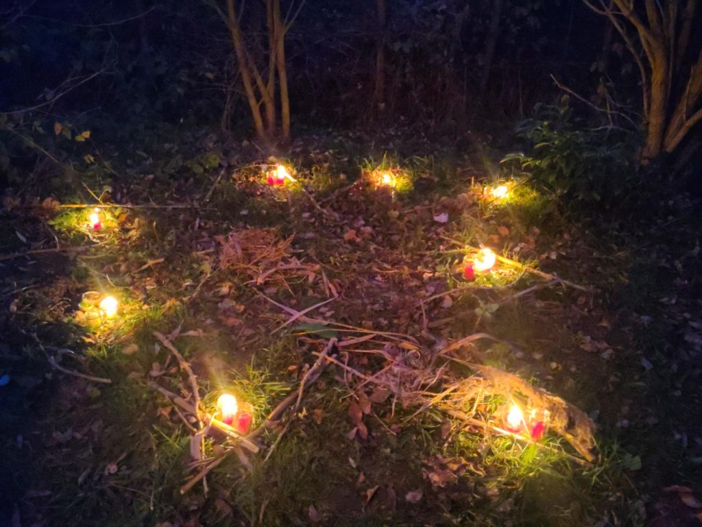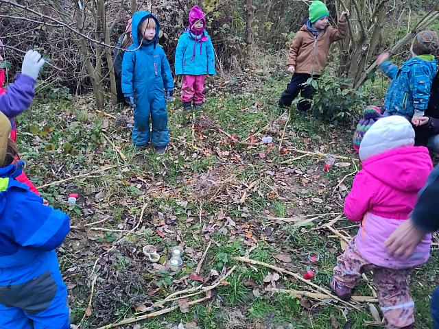 Pünktlich vor dem letzten Treffen des Jahres am 11.12. hat ein Wichtel an Sabine geschrieben. Er hat gesehen, dass auf dem Grundstück so oft Kinder sind, was ihn sehr gefreut hat. Er kann mit allen Tieren und Pflanzen sprechen, und diese können ihn auch sehen und hören. Da Menschen das nicht können, muss er ihnen schreiben. Nun hat er den Kindern einen Brief geschrieben, der erstmal auf dem Grundstück gefunden werden wollte. Nach langer Suche und Verfolgung der Spuren des Wichtels (er hat auf seinem Weg einige Sachen verloren) konnte der Brief auf der Brache gefunden werden: der Wichtel bat die Kinder, für die Tiere einen reich gedeckten Platz für ihre Weihnachtsfeier zu Rotkehlchen einen sternförmigen Platz mit gefundenen Saaten, Samen, Beeren und Windlichtern. Es entstand eine sehr bezaubernde, feierliche Atmosphäre. Im Halbdunkel beendeten wir das Rotkehlchenjahr am Lagerfeuer mit warmen Apfelsaft, Popcorn und Weihnachtsliedern.