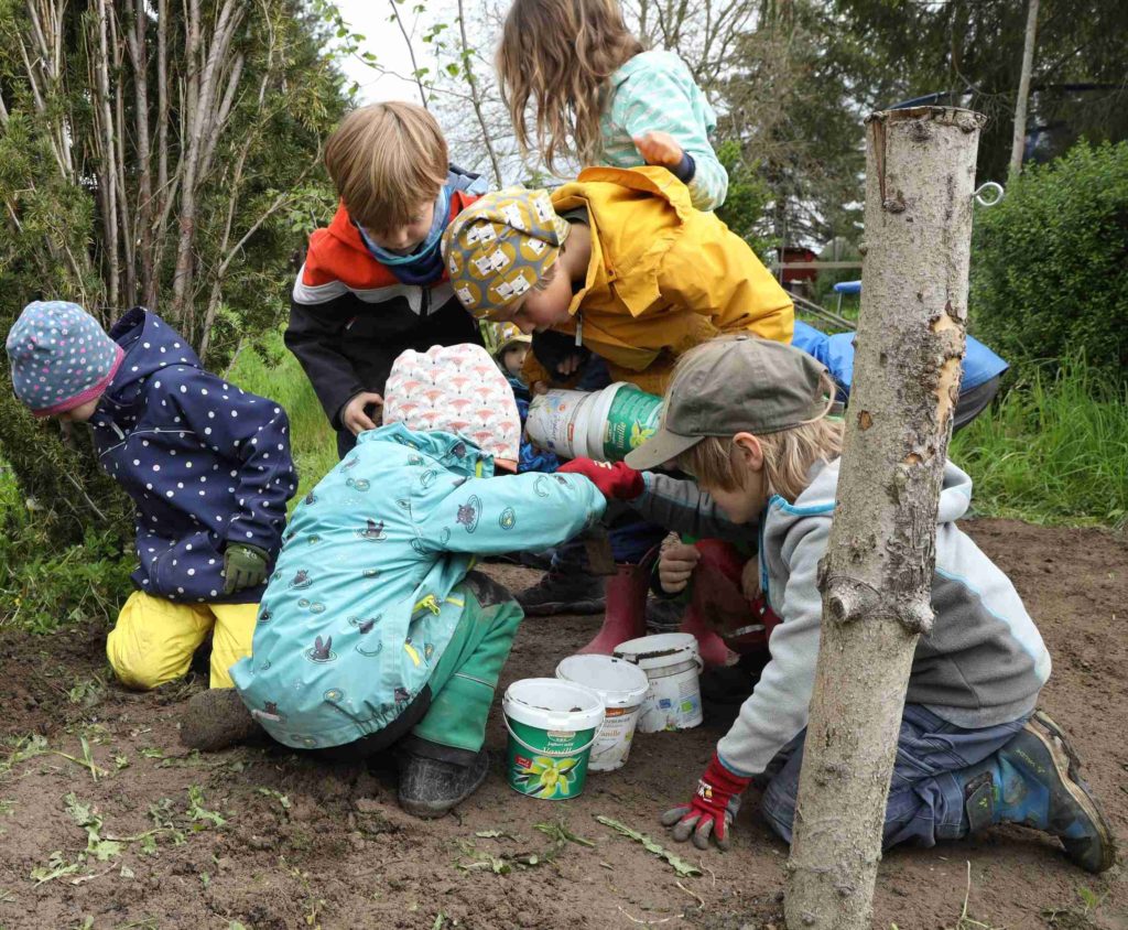 Im Monat April starteten wir mit einem Fühlspiel. Reihum durfte jedes Kind einen verdeckten Gegenstand mit den Händen ertasten und mit Worten beschreiben, bis die übrigen erraten haben, was unter dem Tuch versteckt liegt. Anschließend griffen wir im hinteren Garten-Grundstück zu Schaufel und Rechen: Zunächst wurde dort ein Bereich von Unkraut und Steinen befreit, dann die Erde aufgelockert und geebnet, um Wildblumen einzusäen. Allerlei Bodentiere wie Regenwürmer, Spinnen und Engerlinge wurden bei dieser Arbeit entdeckt. Immer wieder haben die Spatzen- Kinder die Köpfe zusammengesteckt, um eine neue Entdeckung zu bestaunen.