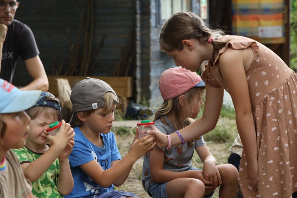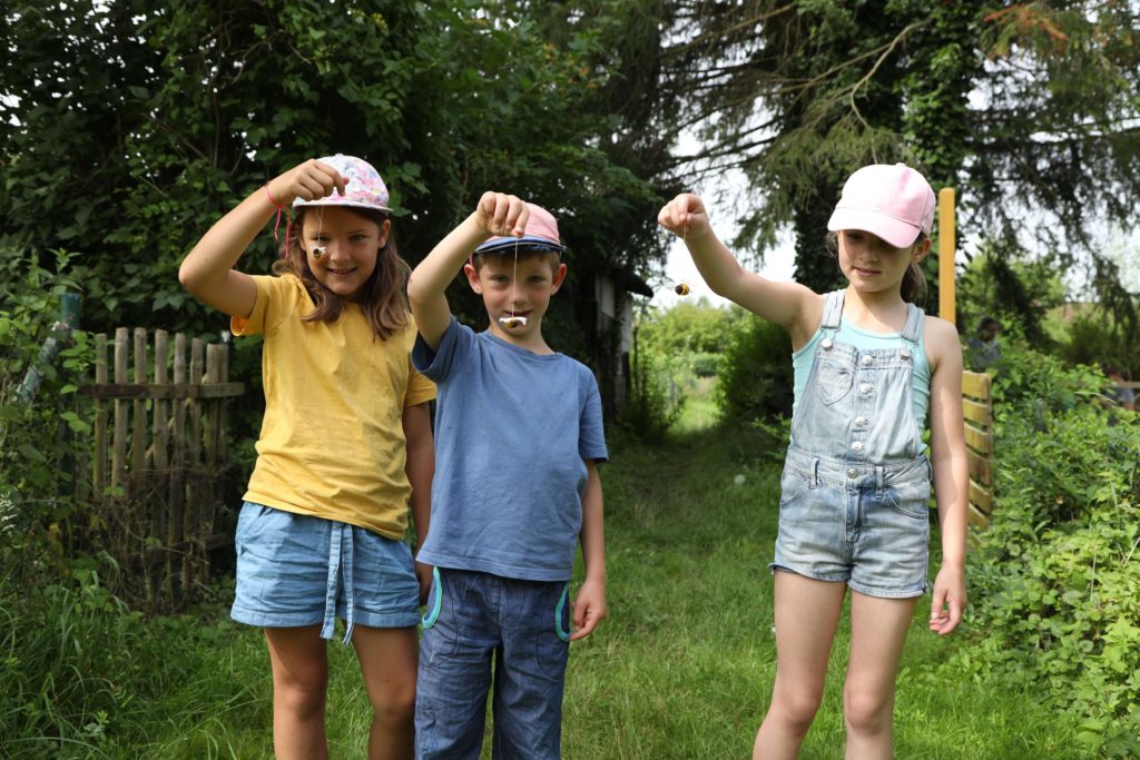 Im Juli haben wir uns mit der artenreichsten Tiergruppe beschäftigt: Insekten. Anhand von Bildmaterial und Tierfiguren haben wir dabei zunächst erarbeitet, welche Merkmale diese auszeichnen. Schließlich durfte jeder durch die Gärten streifen, um nach einem Insekt zu suchen und dieses vorsichtig in einer Becherlupe einzusammeln. Mit Hilfe ausgelegter Bücher wurde versucht, das gefundene Tier zur bestimmen. Nach gemeinsamer Betrachtung der kleinen Lebewesen, haben wir diese schließlich wieder in die Freiheit entlassen. Den dämmerungsaktiven Ohrwurm haben wir an diesem sonnigen Vormittag natürlich nicht gefunden, aber wir haben ihm aus Tontopf, Heu und Schnur ein einfaches Insekten-Hotel gebaut.