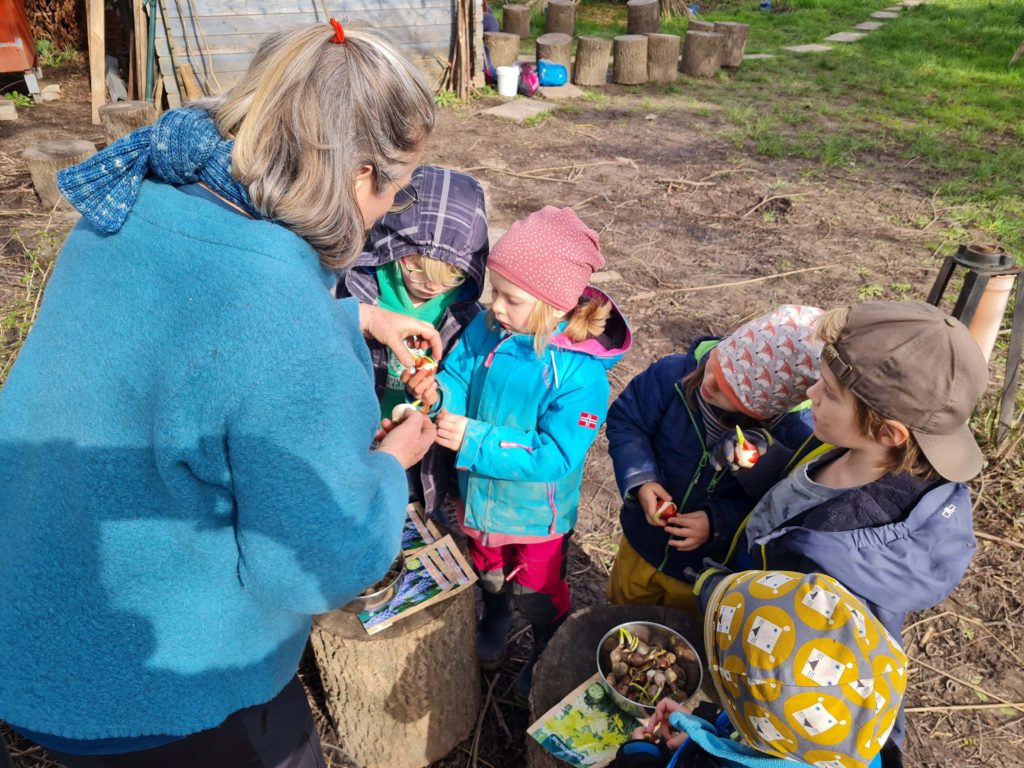 Im März haben wir bei verschiedenen Angeboten den Frühling begrüßt: Während die Einen erfahren konnten, was Igel und Eichhörnchen zu dieser Jahreszeit gerade tun, machten sich die Anderen auf den Weg Richtung Wald, um dort Bärlauch zu sammeln. Unterwegs haben wir nach Frühblühern wie Scharbockskraut, Gundermann, Buschwindröschen, Ehrenpreis und Taubnessel Ausschau gehalten und gelernt, welche essbar oder giftig sind und was Piraten und Hexen damit zu tun haben. Vor dem Bärlauch-Sammeln tauschten wir unser Wissen darüber aus, mit welchen giftigen Pflanzen (Maiglökchen, Aronstab und Herbstzeitlose) er nicht verwechselt werden darf, sodass die Kinder beim Pflücken schnell den reichlich vorhandenen Aronstab erkennen konnten. Zurück im Garten wurde ein leckerer Bärlauchquark zubereitet und mit Pellkartoffeln verspeist. Außerdem haben wir endlich das erste Mal geschnitzt: nach dem Erklären der Schnitzregeln durften die Spatzen einen Osterhasen mit zwei angespitzten Ohren schnitzen, bemalen und mit Stoffen verzieren und schließlich einen Schnitzführerschein mit nach Hause nehmen.