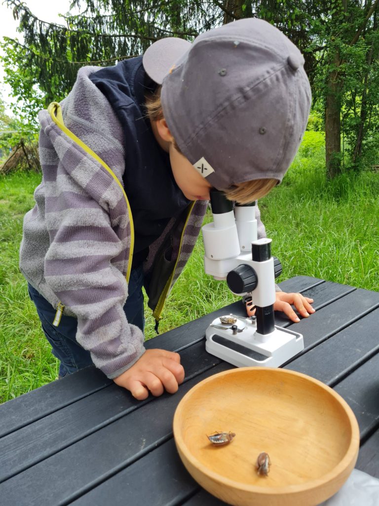 Nachdem wir im Vormonat so viele Engerlinge gefunden hatten, haben wir unser Treffen im Mai dem Maikäfer gewidmet. Wir haben dabei erfahren, dass dieser den Großteil seines Lebens unter der Erde verbringt und mit Hilfe von Lupe und Mikroskop konnte sein besonderer Körperbau ganz genau betrachtet werden. Im Eingangsbereich des Gartens haben wir Sonnenblumen eingepflanzt um in den Folgemonaten bestaunen zu können, wie sie uns über die Köpfe wachsen. Wer noch ein Muttertagsgeschenk vorbereiten wollte, durfte mit dem Mörser getrocknete Kräuter wie Liebstöckel, Oregano, Zitronenmelisse, Brennnessel und Thymian vermischt mit grobem Salz zerstoßen, um so leckeres Kräutersalz herzustellen.