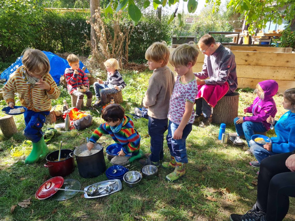 Nach den Sommerferien wollten wir im September wie im Vorjahr gemeinsam Äpfel ernten gehen, doch es waren keine genießbaren mehr übrig. So hat Sabine Streuobstwiesenäpfel mitgebracht, damit wir daraus Apfelmus kochen können. Nach dem Waschen haben wir die Äpfel mit zwei Apfelschälmaschinen geschält, entkernt und zerkleinert. Die beim Kurbeln entstandenen Apfelschalenschlangen wurden dabei gleich verputzt. Während neben dem Mus Milchreis über dem Feuer gekocht wurde, war Zeit für Freispiel im Garten und anhand eines Legespiels konnte der Lebenszyklus des Apfels erarbeitet werden. Schließlich wurde gemeinsam gegessen, es hat wieder sehr gut geschmeckt.