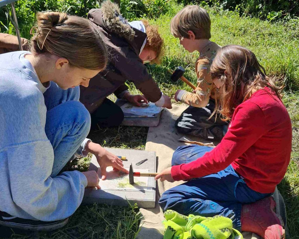 Das Thema des Treffens im April war der wunderbare Löwenzahn. Zunächst zogen wir gemeinsam los und sammelten in der Umgebung Löwenzahnpflanzen in den verschiedensten Stadien. Diese konnten anschließend mit Messer und Lupe genauer untersucht werden, und der Zyklus der Löwenzahnpflanze wurde besprochen. Begleitet wurde dies von einem stetigen Hämmern, denn einige Kinder erstellten mit Löwenzahnblättern bedruckte Stoffbilder. Hoffentlich haben wir dabei den Starennachwuchs im hinteren Garten nicht allzu sehr gestört. Wer aufmerksam war, konnte ihn zwischendurch leise zwitschern hören. Wer im April das Schnitzen verpasst hatte, durfte nun seinen Schnitzführerschein nachholen und einen kleinen Wichtel schnitzen. Währenddessen waren die übrigen Kinder eifrig damit beschäftigt, eine Brücke über die mit Wasser gefüllte Kuhle zu bauen.
