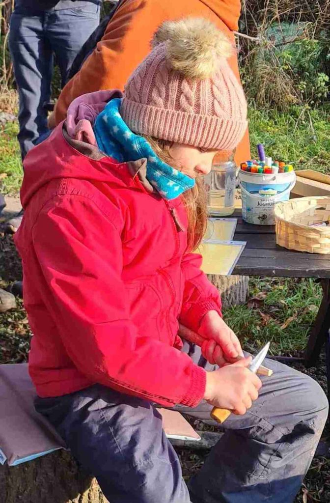 Beim Jahresabschluss-Treffen im Dezember haben wir viel über den Winterschlaf des Igels erfahren und nachempfunden, wie er dabei seinen Stoffwechsel verlangsamt, um Kräfte zu sparen. Danach haben wir uns am Feuer aufgewärmt: Beim Essen der selbst zubereiteten Gemüse-Kartoffel- Nudelsuppe wurde eine Geschichte zum Thema „Überwinterung der Tiere“ vorgelesen, dabei haben die Spatzen gezeigt, dass sie sich damit schon richtig gut auskennen. Anschließend haben wir Wachs geschmolzen, um das zuvor gerollte und gebundene Zeitungspapier hinein zu tauchen. So konnte jedes Kind einen selbstgemachten Feueranzünder mit Nachhause nehmen.
