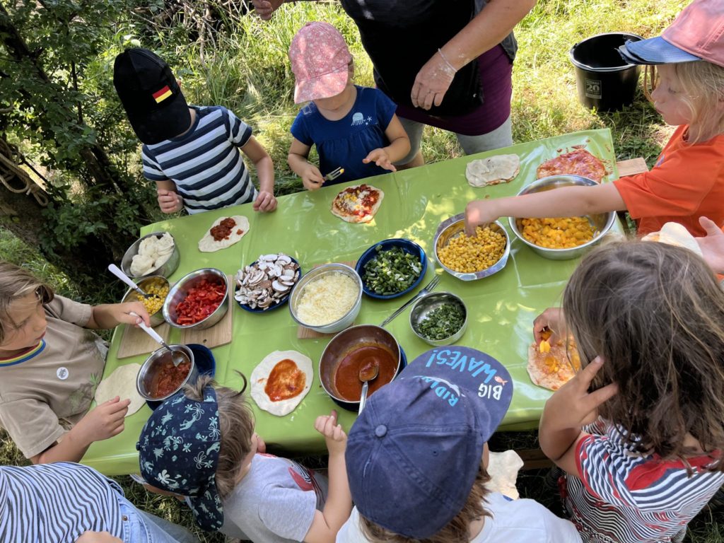 Da wir die vorigen Monate nicht am Feuer gekocht hatten, haben wir uns für das gesamte Juni-Treffen eine umfangreicheren Kochaktivität vorgenommen: Viele fleißige Hände haben Hefeteig geknetet, Gemüse klein geschnitten, Käse gerieben und aus Tomaten und Zwiebeln eine Soße zubereitet. Schließlich durfte jeder einen Teigfladen formen und diesen nach seinem Geschmack füllen, um die Calzone schließlich über dem Feuer zu backen. Lecker! Alle waren so eifrig dabei, dass auch das abschließende Reinigen des Kochgeschirrs gemeinsam mit viel Freude erledigt wurde.