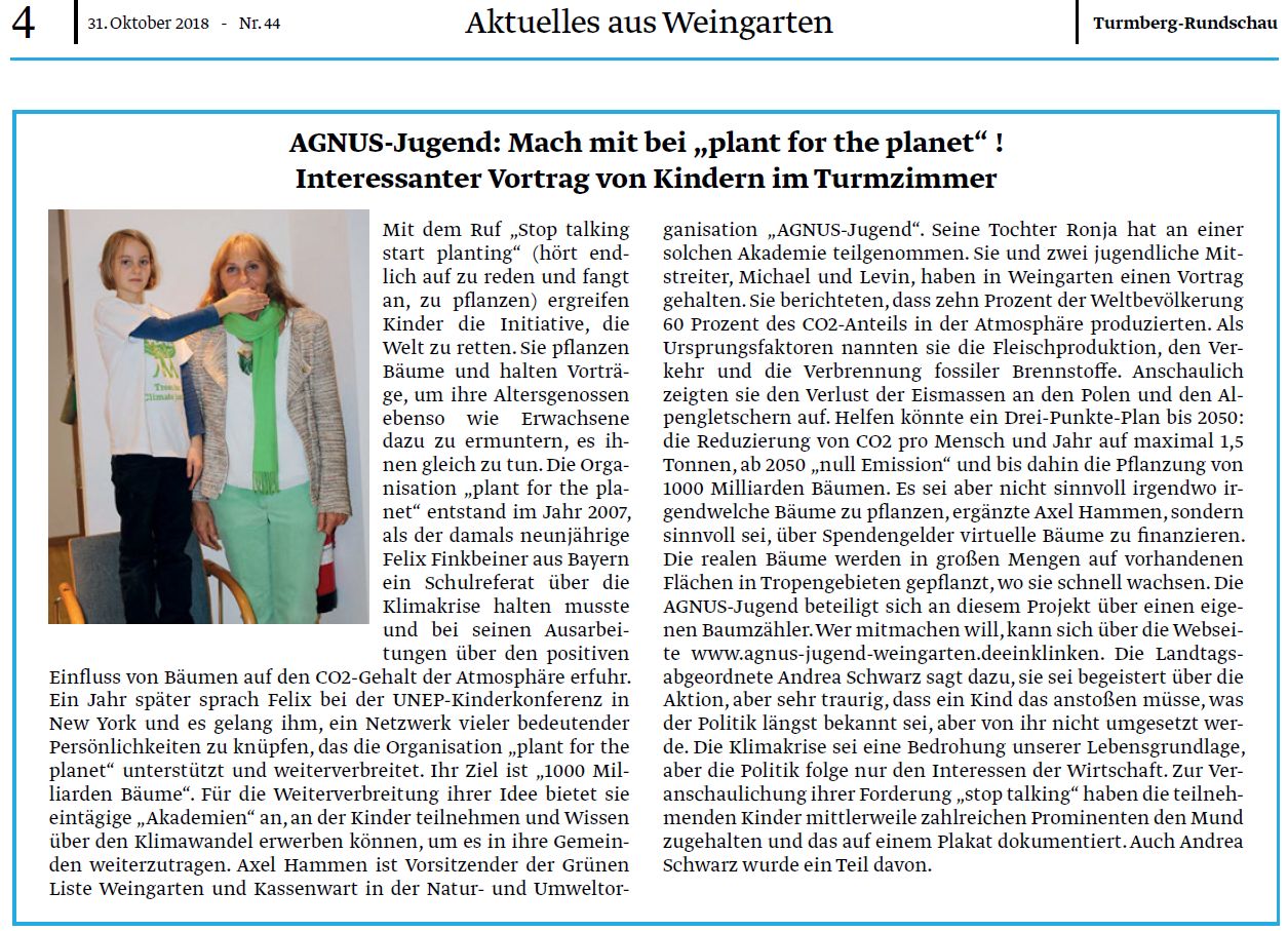 05.11.2018 Plant for the planet: Beeindruckender Vortrag in Weingarten (bei plant-for-the-planet.org)