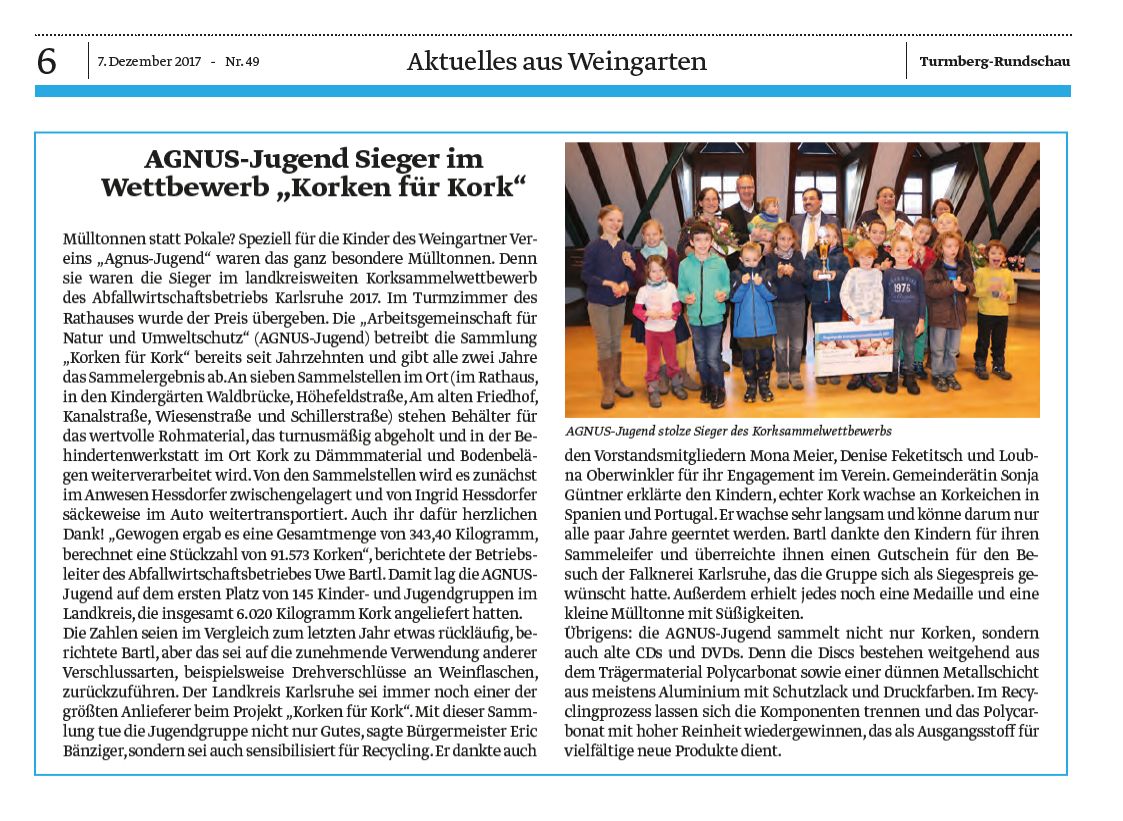 AGNUS-Jugend Sieger im Wettbewerb „Korken für Kork“, Pressemitteilung der Gemeinde Weingarten vom 05.12.2017