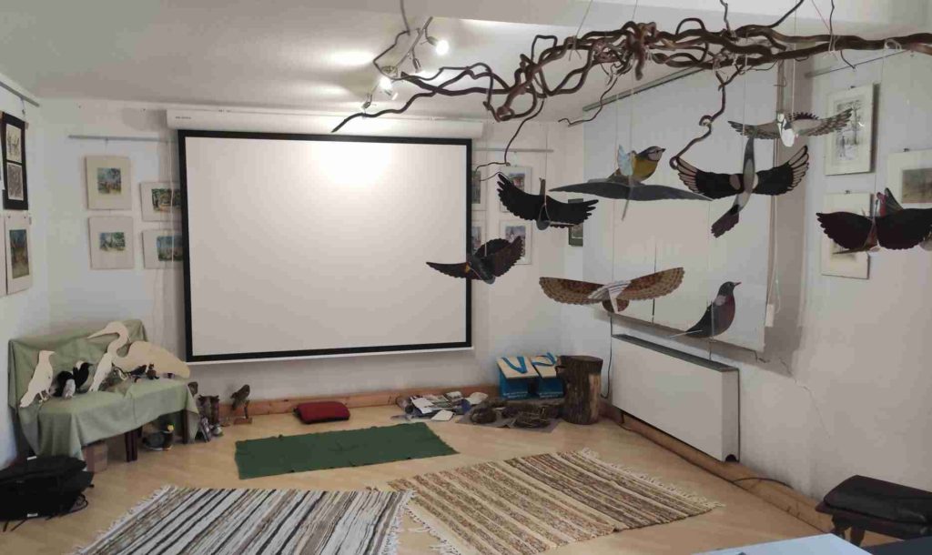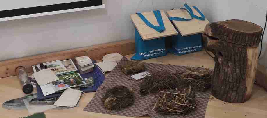 Herr Amsel hat dann Amselsprache erklärt. Eine Holzamsel kann nicht singen. Daher haben wir per Projektor einen singenden Herrn Amsel auf die Leinwand geworfen. Hören und sehen kann man ihn in Weingarten morgens und abends auf Hausdächern vom Frühjahr bis in den Sommer. Weil Vögel keine Zäune bauen, singen sie, um zu sagen, dass sie hier brüten. Der gesungene Zaun gilt aber nur für Vögel der gleichen Art, so darf also Familie Blaumeise im Gebiet von Familie Amsel brüten. Spannend waren auch die Warnrufe von Herrn Amsel. Wenn man sie versteht, dann weiß man, ob der Feind von oben (Greifvogel) oder von unten (Katze) kommt und wie gefährlich nahe der Feind ist.