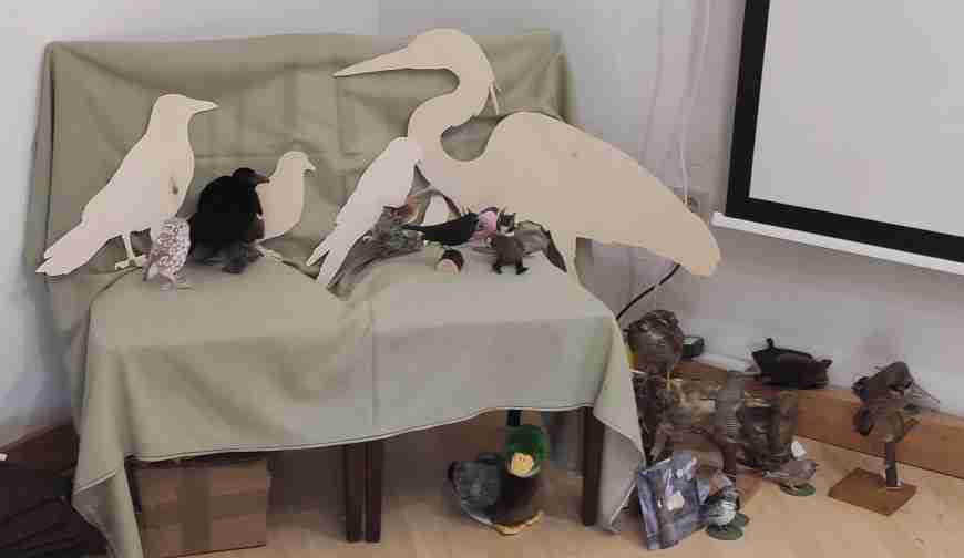 Frau Elster und Herr Amsel haben erklärt, wie und von wem Vogelnester gebaut werden. Die Nester hatten sie mitgebracht, zum Anschauen, zum Anfassen, zum Staunen. Während Frau Kohlmeise sehr weich ausgepolsterte Nester in Nistkästen baut, verbaut Frau Star eher gröbere Halme und Gräser. Frau Amsel baut ein mehrlagiges Nest aus verflochtenen Grashalmen außen, in der Mitte kommt eine Lehmschicht, damit das Nest schön stabil ist, und innen befindet sich ein weiches Polster. Herr Buntspecht meißelt mit seinem Schnabel Höhlen in Bäume. Am fleißigsten ist Herr Zaunkönig, der sehr viele Nester baut, damit sich Frau Zaunkönig das schönste aussuchen kann. Aber weil Zaunkönige ihre Nester jedes Jahr wiederverwenden, darf man sie nicht mitnehmen, und daher gab es von Familie Zaunkönig kein Nest zum Anschauen. Von Familie Elster auch nicht, weil das überdachte Nest sehr hoch in Bäumen gebaut wird. Ein Vogel baut keine Nester, das ist Frau Kuckuck. Was die macht, haben wir auch besprochen.