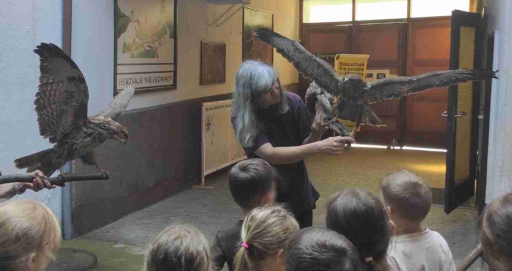 Anschließend haben wir einen Ausflug in den Museumshof gemacht, wo uns Herr und Frau Mäusebussard (ausgestopft) begrüßt haben. Beide haben sehr scharfe Schnäbel, sehr spitze Krallen, weiche Federn am Bauch und harte Federn als Flügel. Wir haben mal geschaut, wer die größere Flügelspannweite hat, die Bussarde oder die Kinder. Tatsächlich hatten die allermeisten Kinder fast die gleiche Armspannweite wie die Bussarde.